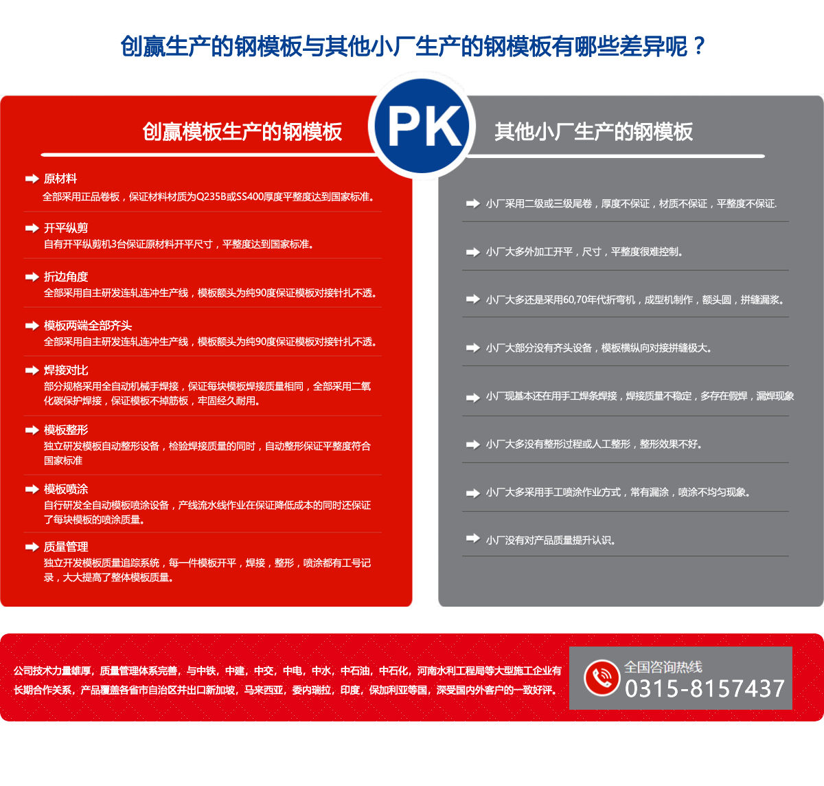 唐山創(chuàng)贏模板有限公司(原唐山豐南雙贏金屬結構廠)始建于一九九七年,是具規(guī)模實力的組合模板生產企業(yè),公司自行設計制造的十二條上卷,連軋,連沖,整形,機械人焊接,調直,噴漆,打包鋼模板生產,實現了自動化一條龍生產,品質優(yōu),效率高,規(guī)格型號為:寬度100-1200mm, 長度300-3000mm, 板厚1.8-4.0mm。 年產量可達200萬平方米,公司創(chuàng)新研制的輕型鋼框組合快拆鋼模板體系,是傳統(tǒng)組合小鋼模升級換代產品,可滿足房建,地下管廊,涵洞,公路,鐵路及各類施工企業(yè)的需要,輕型鋼框組合快拆鋼模板體系介紹及應用,已在2017年《施工技術》雜志及《模板腳手架行業(yè)協(xié)會》雜志發(fā)表,詳情請查閱公司網站。 公司生產的噴漆鋼跳板,鍍鋅鋼跳板,采用連軋一次沖孔,承載力大,孔距均勻,外形美觀,年產量可達50萬塊,公司獨創(chuàng)的C型鋼生產線,以其產量高,強度大,成本低,交活迅速,在同行業(yè)占有較大優(yōu)勢,可與C型鋼廠家及各類施工企業(yè)合作共贏.